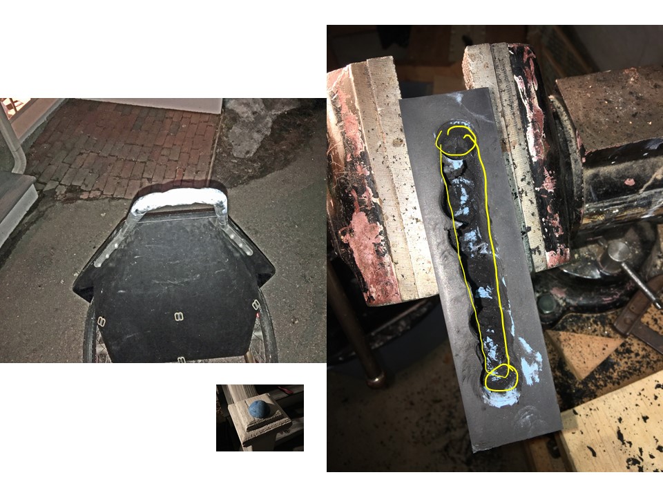 I didn’t want to wreck the integrity of the pole here so I decided I was going to just drill out a cavity and allow the insertion of the full U shaped top of the trailer pole, right up through. Mainly I did not want to modify and cut the factory hitch pole. I wanted to keep it intact. So I hollowed out a cavity in the rubber to house the U shaped trailer pole. I used a ¾ inch spade bit to channel the opening. As I came closer to full excavation I needed to work with more precision. I chalked the top of the U pole: And then kept pushing down the rubber opening to get chalk on the obstructing parts. I kept putting it on and then drilling out more where the chalk appeared. A bit like a dentist who asks you to grind your molars on articulating paper to see where he needs to file down a molar crown.