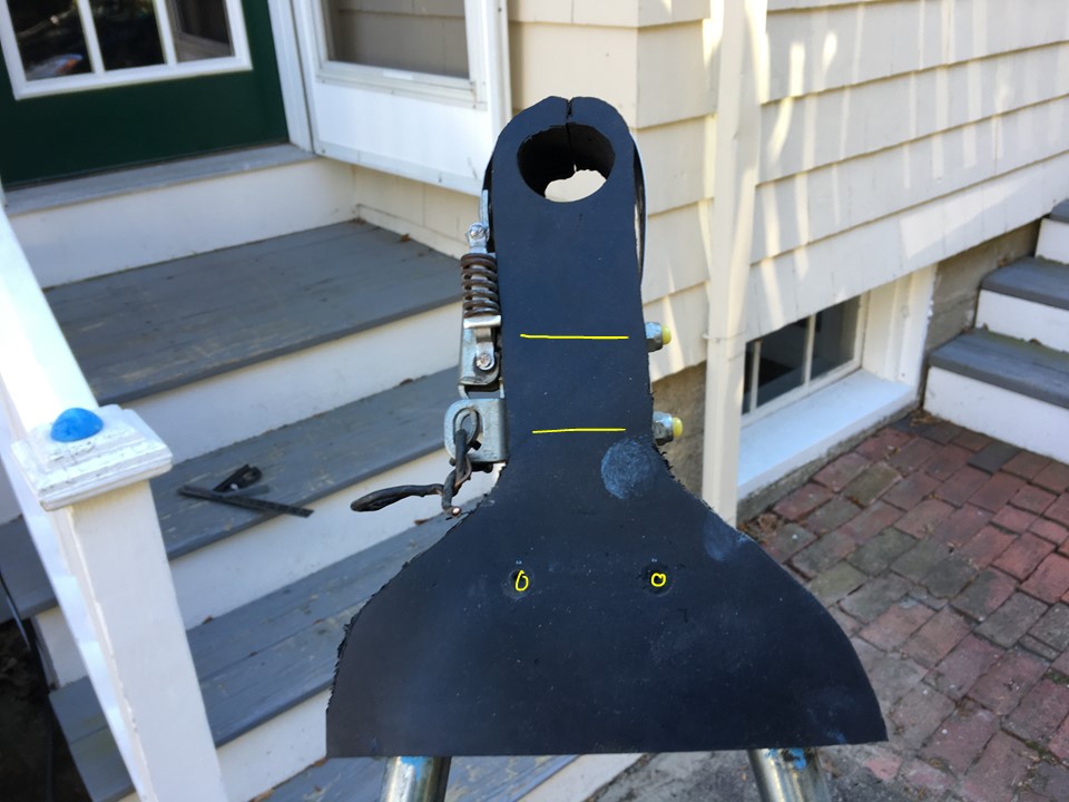 When I finally got a clean fit. I slit the seat post opening and then I pushed it onto the pole. I marked and then drilled the holes for bolts (original) to tie the hitch rubber to pole. Finally I screwed these on. You install the same original hardware back in using the same drill bit size about a quarter of an inch drill. You’ll see these two holes on the old Trailer Pole.
