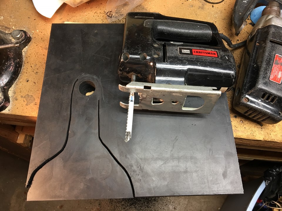 The cutting is relatively easy, smooth going. Once cut out you can attach it to the to what Cannondale refers to as the “Trailer Pole”, this metal pole pictured here. (Here are dimensions for the hitch fittings in PDF.)