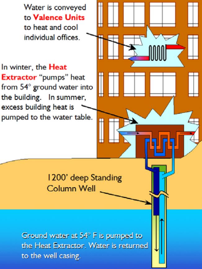 By either submerging fluid carrying pipes underground cooling (AND Heating) systems can pull in 55 degree fluid from the ground source, cool it a bit more if needed via a heat pump and then distribute it throughout the building returning the heated fluid back to the top of the ground circulation for a cooling route through the ground. There are many ways to link to ground As pictured: