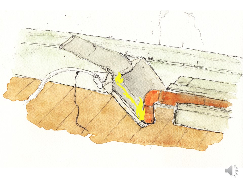 We left the heating system as it was until we could get a plumber to fix it all. In October, 3 months later, Paul Dickhault a wonderful plumber came and looked for the leak in the living room heating pipe. He found it quickly as a small hole at the base of the pipe at floor level.