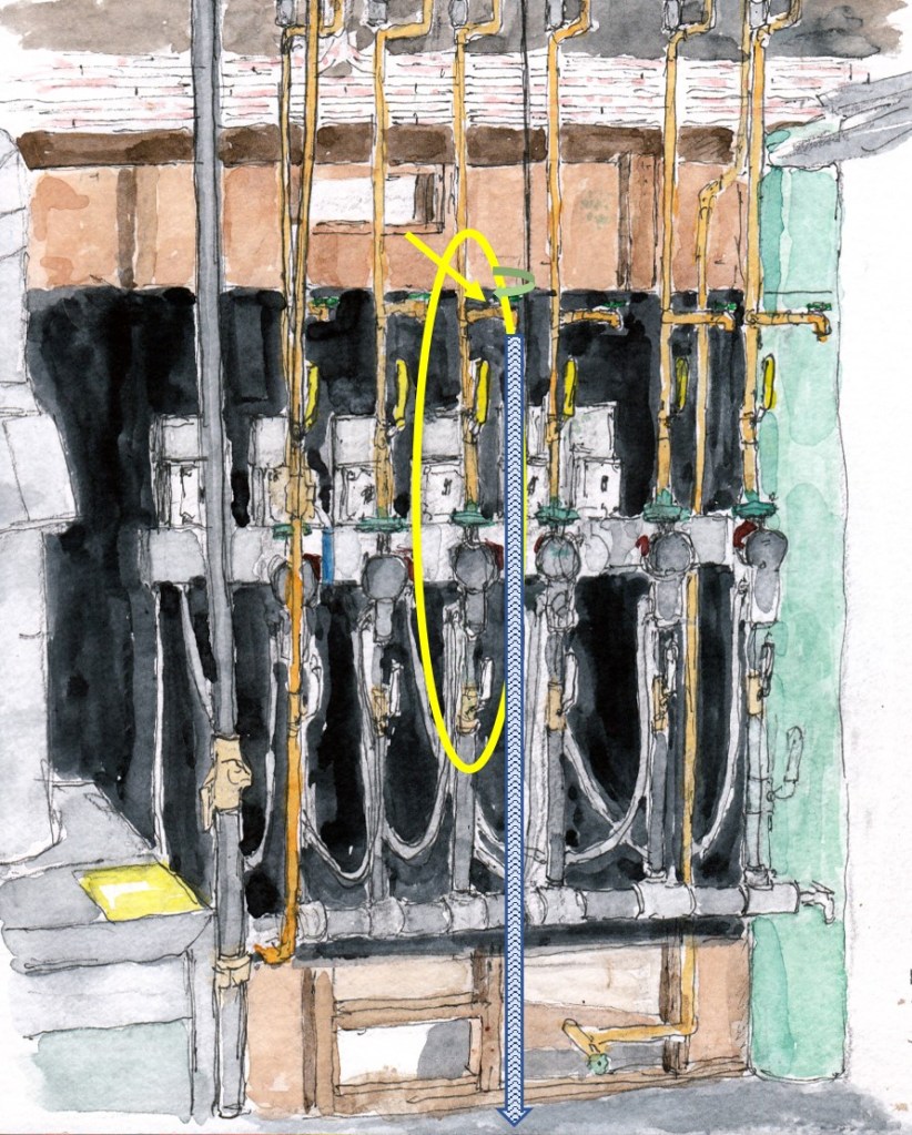 We felt better that it was a heating system leak because we could simply isolate that heating zone, zone 3 the front of the first floor, by closing the valve and then drain all the water from that circuit. But the water kept coming and would not stop; bucket after bucket. Then Tricia suggested shutting off the incoming cold water supply valve. Well that did it as the water outflow eventually stopped and we focused on lots of cleanup.