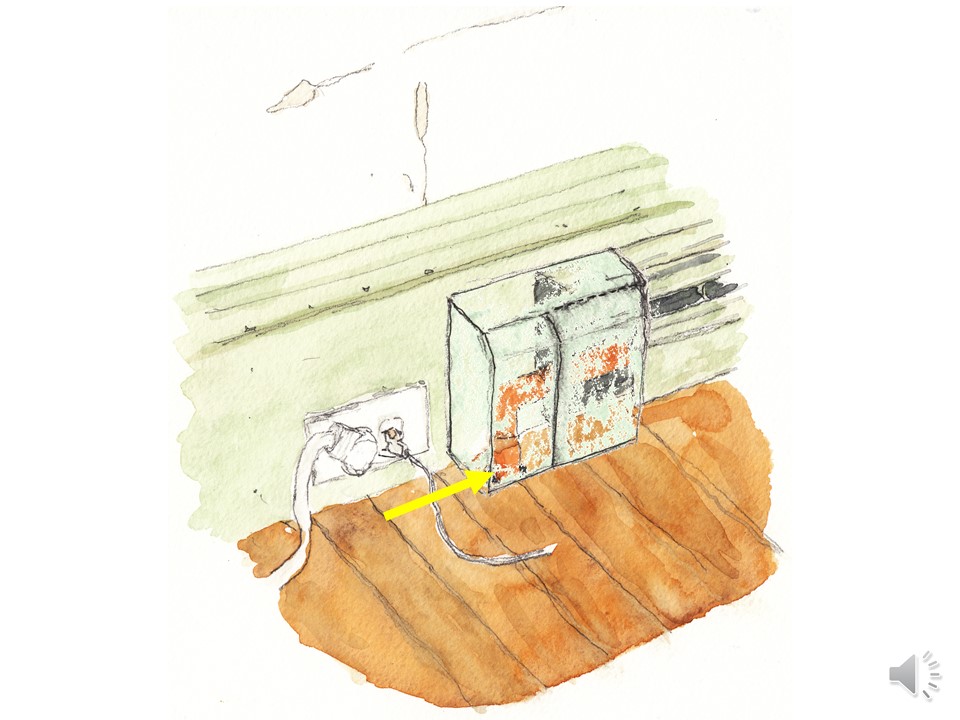 …and he said I can tell you exactly what happened, the metal heater end cap got knocked back into the broken exposed extension cord plug and carried an electric current down next to the copper pipe. Copper is an excellent conductor and so is the water behind it. That caused an electric arc from outlet to extension plug to end cap to copper pipe. The arc is so hot, almost 10,000 degrees Fahrenheit that it burned a hole right into the copper pipe and so the leak began. And that is what tripped the relay for the electric circuit in this room.