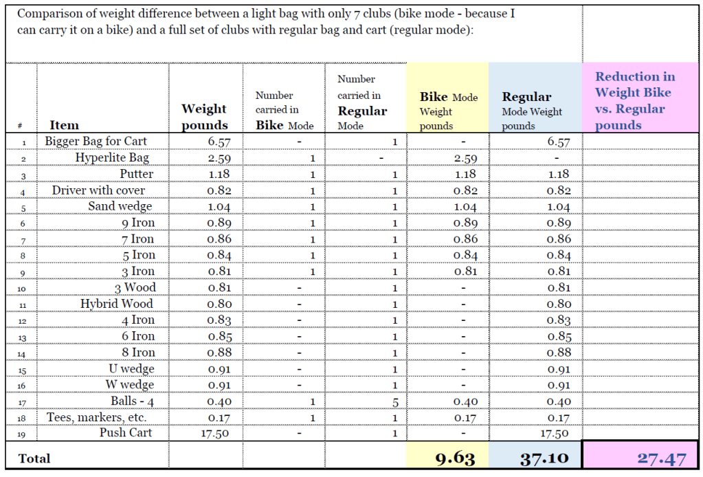 The hyperlite bag with 7 clubs and fewer balls, “bike mode”, weighed only 9.63 pounds, 75% lower than a full bag and cart , “regular mode”, which weighs 37 Pounds!