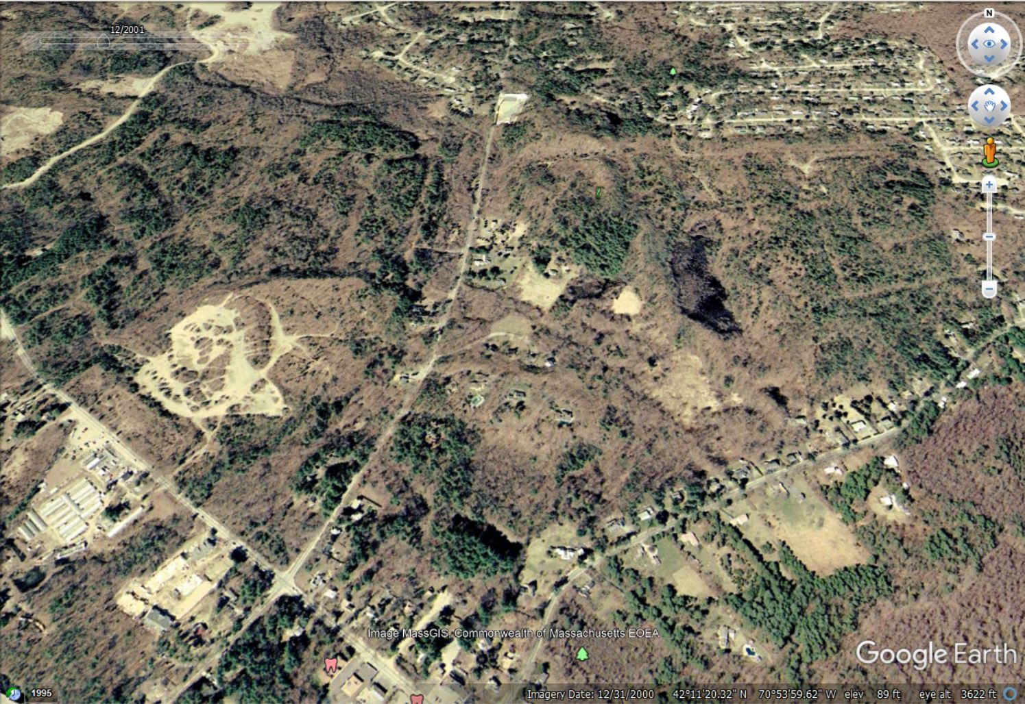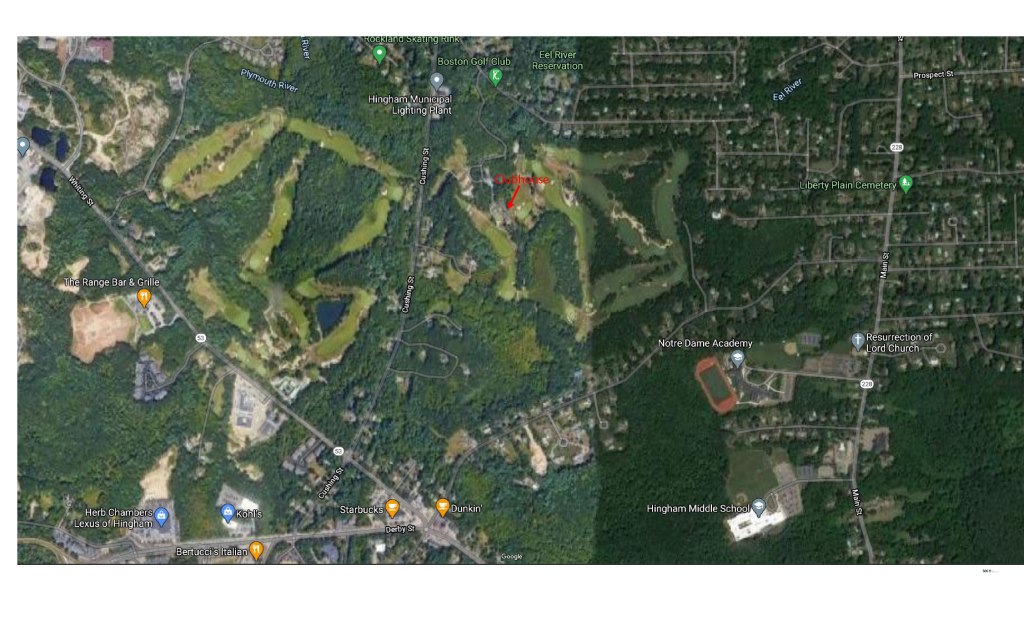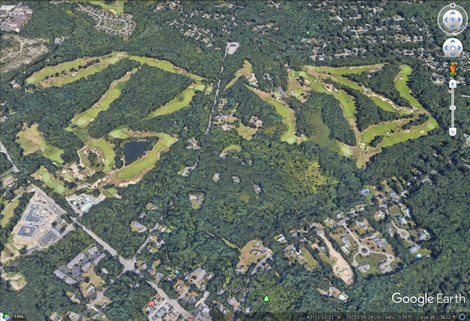 I enjoyed a wonderful golf day with friends at the Boston Golf Club, a quiet beauty hidden in the heart of Hingham. It arose from the woods and a former sand pit at Penniman Hill (left), as these Google Earth pictures from 2001 and 2020 show. Slide the slider left and right to see before and after views: