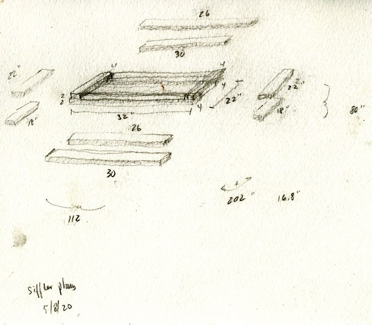 We had the mesh wire, and enough pressure treated boards left over to make it happen. I began to figure out dimensions that would fit the wheel barrows, measured some distances and sketched some options.