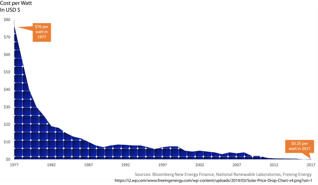 We kept hearing about astounding advances in solar collection technology. The cost to generate electricity with solar had dropped by a factor of 300 over the last 40 years, as pictured here: