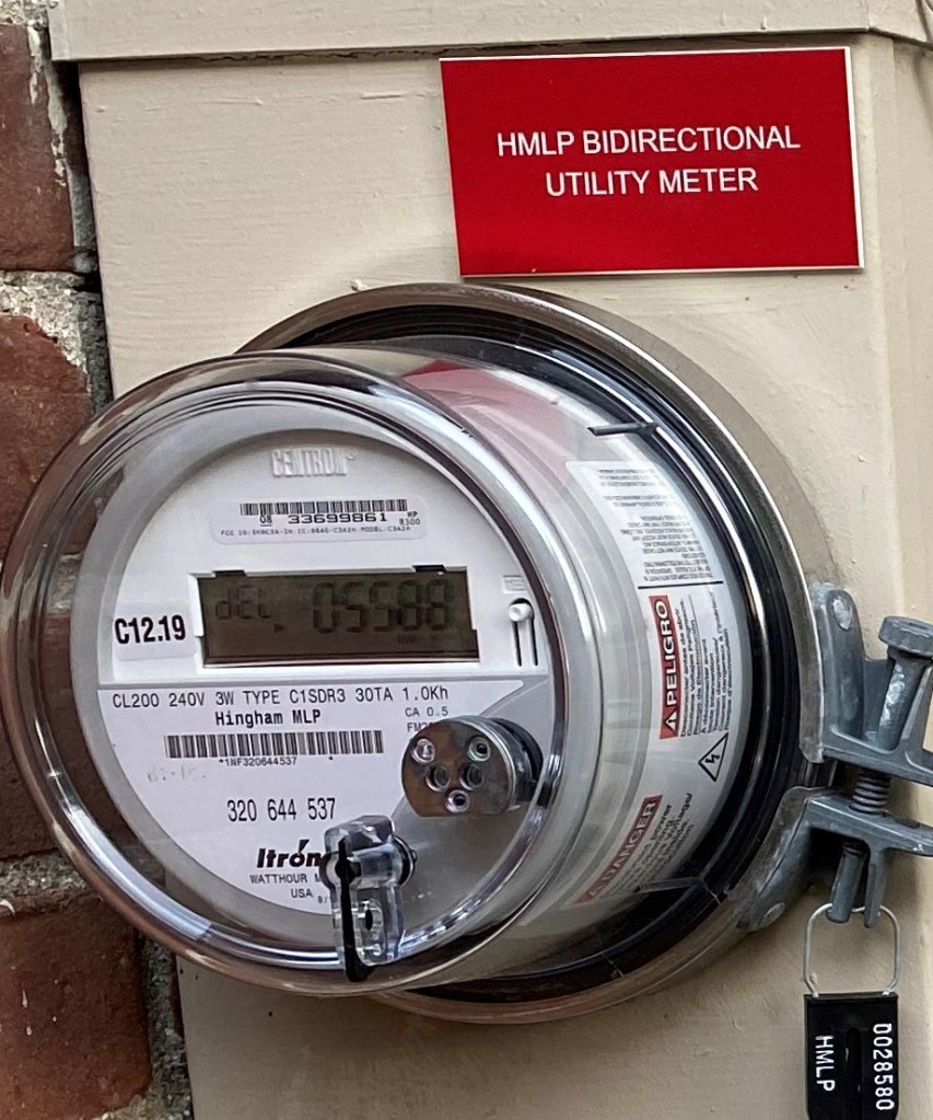 Most suprising to us, our electricity provider, small and local Hingham Municipal Light and Power (HMLP), actively encourages residential solar. It provides a “net metering” option which allows for the homeowner to “sell” excess daylight energy back to the “grid” / the utility and tap into the grid for nightly use of electricity when the panels are not generating. The net meter works as pictured below.