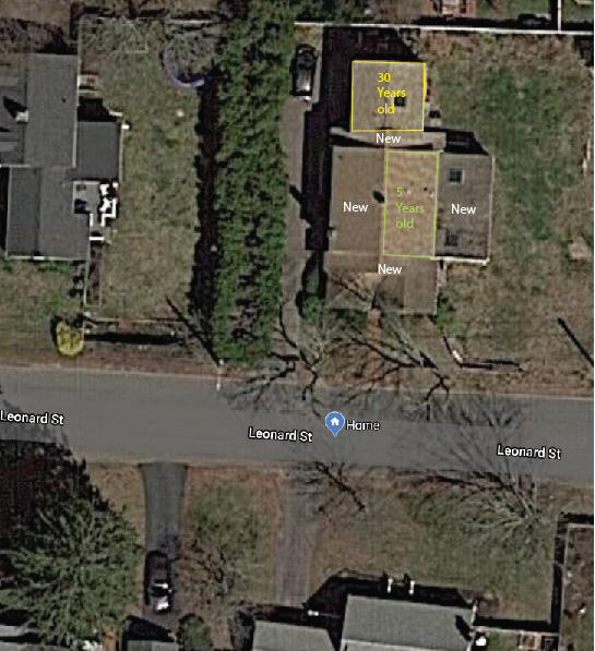 Josh thought it would work based on a site assessment. Since we had already cleared 4 large trees in the yard (see Trees Too Risky to Keep on this site) the roof got almost full sun. Another factor relates to the age of the shingling on the roof. Installers want to add panels only onto recently shingled “new” roofing to avoid the cost and expense of having to remove and return panels should the roof shingles need replacement soon after solar installation. We had done our multiple re-roofings in different phases over the year as pictured.