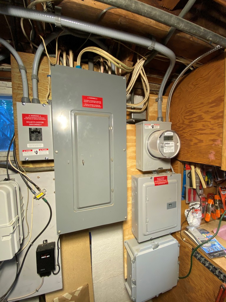 …and down to the new solar electric junction box tied into the main board in the cellar.