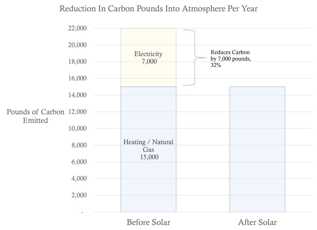 According to the U.S Energy Information Administration (EIA), in 2019 the average U.S. residential utility customer consumed 10,649 kilowatthours (KWh) per year. Our residence only used about 5,800 kWh in electricity per year. Even at that lower usage rate (and using the New England figures) we caused almost 7,000 pounds of carbon to go into the air to get this much electricity! Solar panels would reduce this 7,000 pounds to just about zero as depicted below. [Note that we still use natural gas for heating and cooking and we include that carbon emissions level, 15,000 pounds, on the chart.]