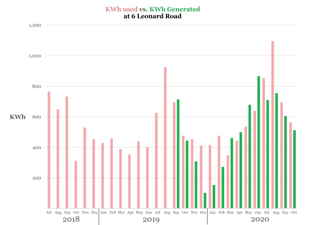 Note that we peak usage in July and August and those peaks rose from 2019 to 2020. Also in those months our use exceeded our production. Note starkly reduced solar production in December and January due to our northern latitude. Note also that in March, April, May and June our solar output exceeds our usage. From July 2019 to July 2020 we used 6,842 KWh while we generated 5,967 KWh, an 875 KWh shortfall.