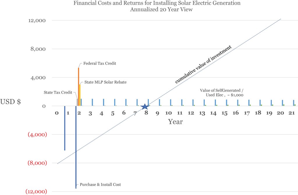 In May of 2018 a door to door solar energy salesman talked with me as I was working on the front lawn. He talked about federal, state and local incentives for solar panels and explained I had a wonderful location for solar collection. I did not commit but the conversation advanced something we had always intended to do – install solar panels. A few factors had piqued our interest…