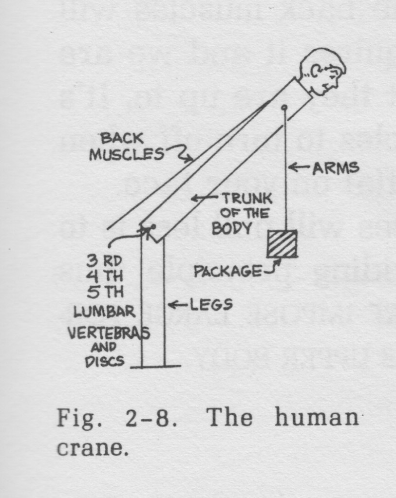 First he diagnosed the problem: too much pressure on the lumbar hinge joints when one tries to lift an object from a forward lean. As a physicist he described our back lifting as a crane: