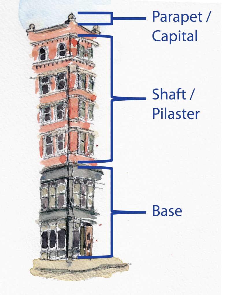 …an early attempt to organize exterior elements of a tall office building as if it were a giant column, with articulated base, shaft and capital. … The first two stories (the base) are [glass and iron / shops and storefront], … upper stories in brick. The verticality of the “shaft” is emphasized with pilasters that extend from the third story to the [sixth] parapet…”.