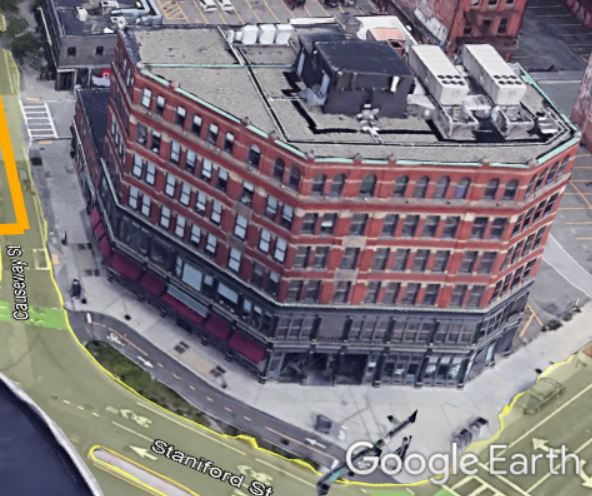 This view blended three architectures: at the center a beautiful late “Victorian Commercial” brick building from the 1880’s, to the right a concrete “brutalist” architecture building –the Health, Welfare and Education Service Center named “Joseph A. Langone, Jr., Memorial Center” — designed in the 1960’s by Paul Rudolph , and beyond both a conventional floor-to-ceiling blue-ish glass box from the 2010’s at 84 Causeway Street.