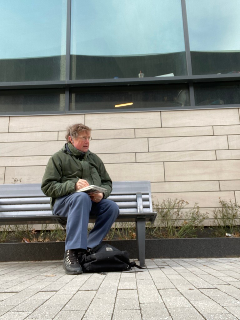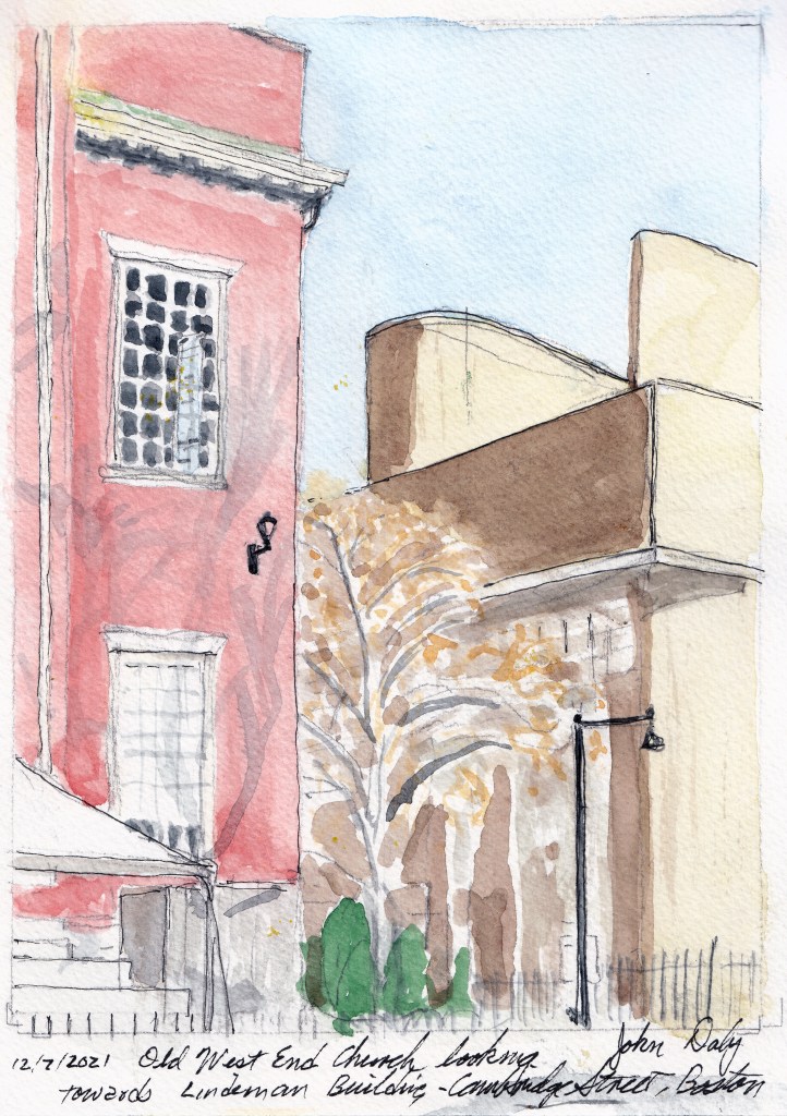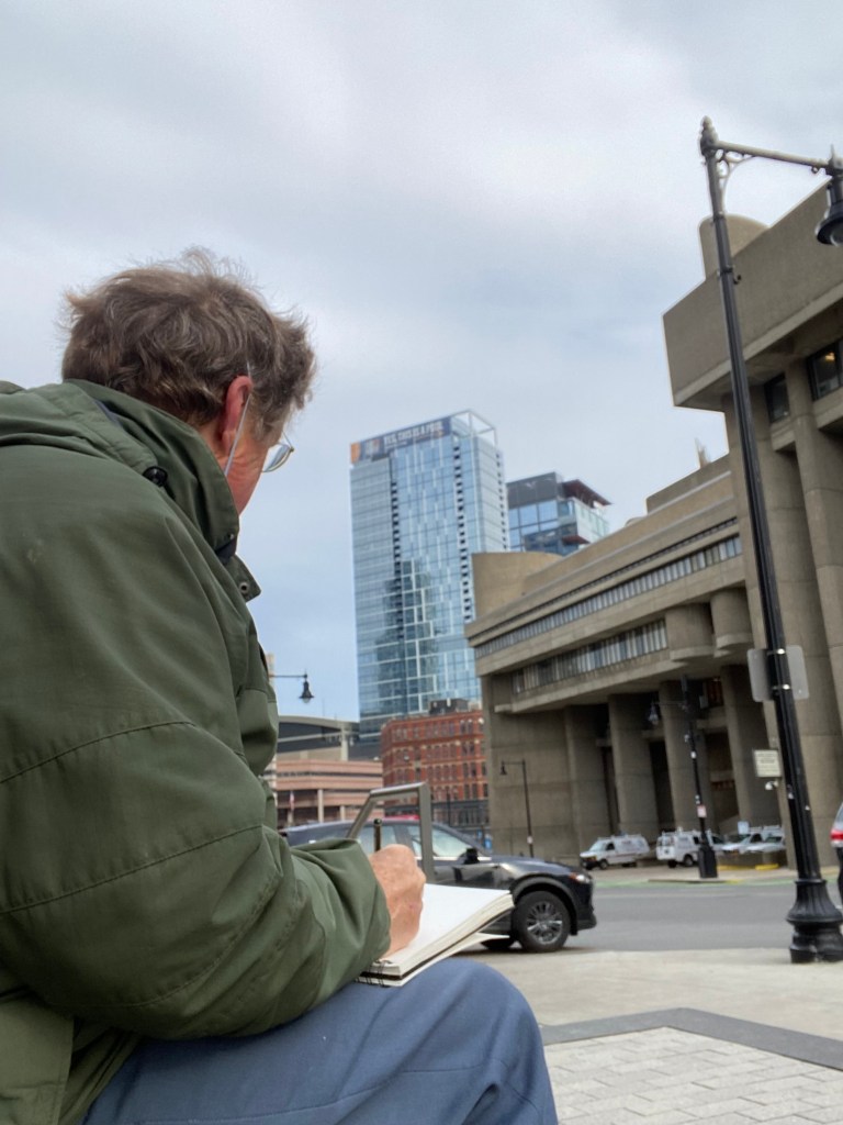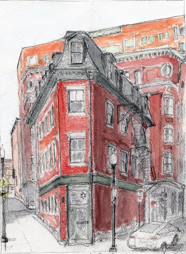 The first day I took a short walk from the PT clinic over to Staniford Street and found a great set of benches with a view to sketch the scene looking downhill down Staniford S.