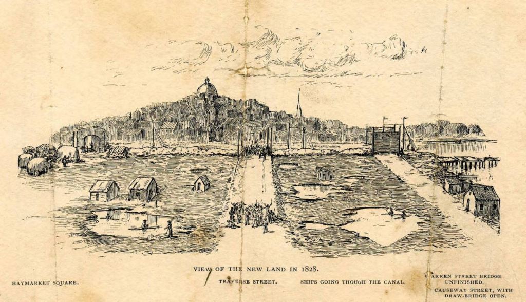 Haymarket Square. Traverse Street. Ships going through the Canal. Warren Street Bridge Unfinished. Causeway Street with Draw Bridge Open. https://commons.wikimedia.org/wiki/File:View_of_the_new_land_in_1828,_Boston.JPG. Retrieved January 31, 2022,
