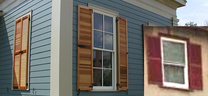 We notice functional wooden shutters that operate on hinges to close over the window, fully. Not “decorative”, these worked and every window had functional shutters. They added to the home’s symmetry and color.