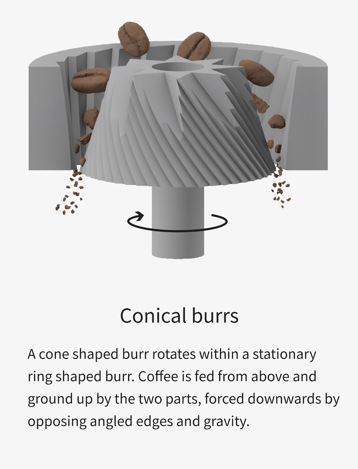 Burr Grinders crush beans between two surfaces, producing consistent particle sizes. Consistency is key to unlocking the full potential of your beans